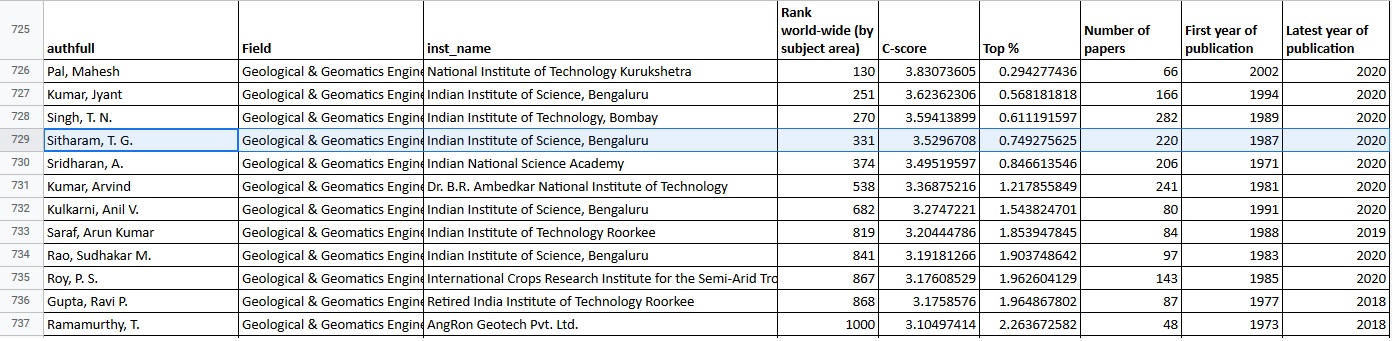 Listed in World Ranking of top 2% Indian scientist in Geological & Geomatics Engineering .