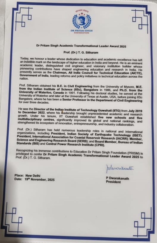 GS-Kueckelmann Award 2015 with a cash prize of Rs.35,000 for "Outstanding Cumulative Contribution in Geotechnical Engineering" from Indian Geotechnical Society, October 2015. The prestigious Indian Geotechnical Society – Kueckelmann award is presented once in two years to an eminent geotechnical engineer who has made a significant contribution to the profession in India. So far 18 eminent Geotechnical Engineers have thus been honored.