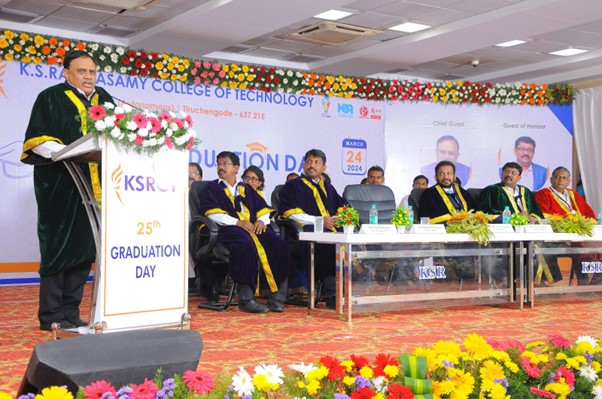 I am very glad to attend the 24th Graduation Day of KSR Rangasamy College of Technology. First and foremost, I extend my heartfelt congratulations to each and every one of you. This day signifies not only the culmination of years of hard work, dedication, and perseverance but also the beginning of a new chapter in your lives filled with endless possibilities. My dear students, the next phase of your life is filled with lots of responsibilities, ambitions and growth. The education, learning and experience you have gained here will help and advantage to succeed ahead in future.